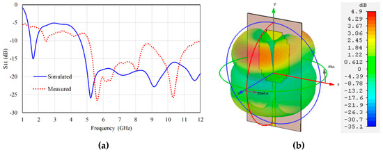 Two typical wideband monopole antennas covering the frequency range from 5 to 10 GHz were designed and optimized to verify the proposed tag experimentally. The antenna is shown in Figure 14, and its parameters are listed in Table 3. Figure 15a shows the simulated and measured return loss. The measured bandwidth for S11 < −10 dB was extended from GHz to 12 GHz. In addition, the 3D radiation pattern at 7 GHz is displayed in Figure 15b.