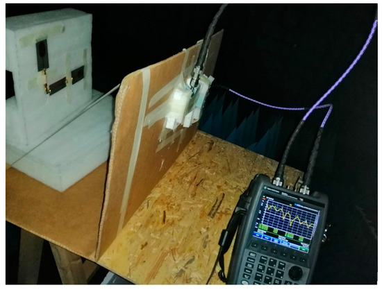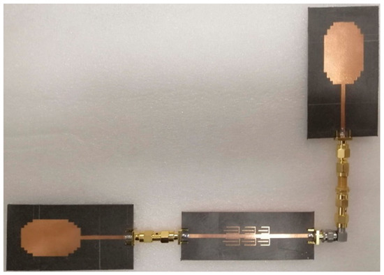 The two antennas were connected to opposite ends of the feeder line of the six-resonator structures implemented in the previous section. The two antennas were placed in an orthogonal-polarization arrangement, as shown in Figure 16.