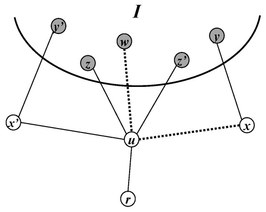 Figure 1. An iteration of Algorithm 1. After edge is included in tree T, the D-GENfunction randomly picks from and adds it in tree T with probability . - Among some neighbors in that have an edge to I (Line 7, x and in Figure 1), we randomly pick a node (e.g., node x) and set it as a detour node with probability . The probability is calculated as in Equation (5), where m is obtained from the number of paths between x and any nodes in I, and , respectively. If node x is set as a detour node, edge is added to the tree (Line 9).
