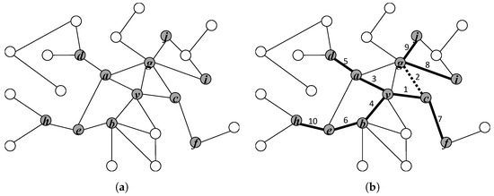Figure 2 shows an example tree construction under our STG algorithm. Suppose that the network graph and the set of infected nodes are given as shown in Figure 2a, where the infected nodes are marked in gray and the edges are shown as a line. Starting from sets and , we randomly pick an edge from , e.g., , and add the edge to T and node c to I. After updating I and removing from , we check whether there exists a neighbor of node c that is not included in I and has an edge to I except with node c and select one of them at random. In this case, since we have only one such node (node g), we select node g. Then, we set node g as a detour node with probability , where from Equation (5), since node g has one direct path and two two-hop paths to node v. If node g is not set as a detour node, then we go back and randomly select another edge from and repeat the procedure. If node g is set as a detour node, we add edge to T and node g to I, then go back and randomly select another edge from , and repeat the procedure. If becomes empty, we reconstruct it from the current set I. Figure 2b illustrates a spanning tree generated by STG, where thick edges denote the constructed tree, and the number associated with each thick edge denotes the order added in I. The dotted line denotes the edge added as a detour.