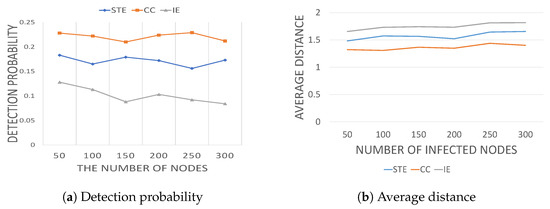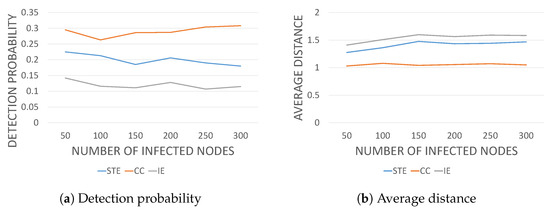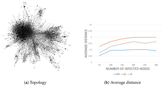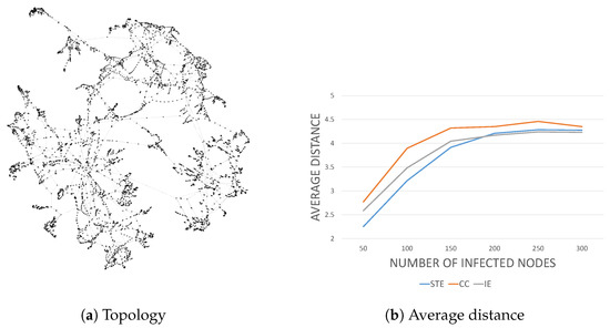 For the IAS network that consists of 6474 nodes and 13,895 edges, we chose an infection source and emulated the infection process. We conducted 200 simulations, varying the number of infected nodes. In the IAS network, STE clearly outperformed CC and IE, as shown in Figure 7b.