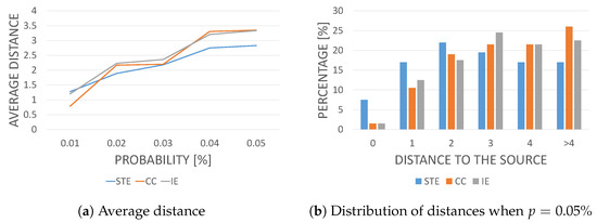 Figure 5 shows the performance results for p-edge networks. As we increased p, the network connectivity became denser. We can observe that, in contrast to the previous results with trees, where CC showed the best performance, when we added cycles in trees, the detection performance of CC and IE was similar, and STE slightly outperformed them, as shown in Figure 5a. The detailed distribution of distance to the actual source (when ) is shown in Figure 5b, and it clearly shows that STE achieved better detection performance than CC and IE.