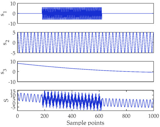 where , , and represent the three components of . The time-domain waveform of simulated signal is shown in Figure 2. For EEMD, CEEMD, CEEMDAN and its modified version, the noise standard deviation and the ensemble size are set to 0.2 and 60, respectively. Figure 3 shows the decomposed results of simulation signals. Since the decomposition results of EEMD and CEEMD are similar, only CEEMD is shown in Figure 3b.