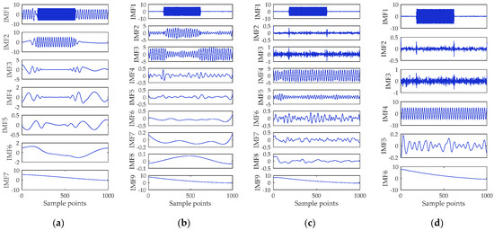 Decomposition results of simulated signal by (a) empirical mode decomposition (EMD); (b) complementary ensemble EMD (CEEMD); (c) complete ensemble EMD with adaptive noise (CEEMDAN); and (d) modified CEEMDAN (MCEEMDAN).