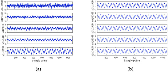 when the parameters , and , the system is in typical chaotic state. The equation is integrated by using a fourth-order Runge–Kutta method with a fixed step size of 0.01, and the initial values of the equation are , , . The y component signal with a length of 2048 points is selected as a chaotic signal, and the signal are added the white Gaussian noise with SNR = 11 dB. The time-domain waveforms of the noisy signal and the noiseless signal are shown in Figure 6.