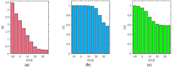 Entropy values of noisy simulated signals. (a) sample entropy (SE); (b) permutation entropy (PE); and (c) dispersion entropy (DE).