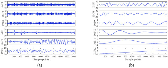 First, the noisy Chen’s signal is decomposed by MCEEMDAN. Figure 7 shows that the Chen’s signal is decomposed into 12 IMFs. It can be seen that the frequency decreases with the increase of IMF order. The DE of each IMF is calculated, and DE values are listed in Table 3.