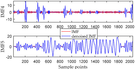 As can be seen from Table 3, since DEs of IMF1 to IMF3 are both greater than 0.88, they are judged as noise IMFs. The last IMF with DE greater than 0.65 is IMF5, so IMF4 and IMF5 are determined to be noise-dominated IMFs. IMF6–IMF12 are pure IMFs. The noise-dominated IMFs are denoised by the interval thresholding method. The time-domain waveforms of IMF4 and IMF5 before and after noise reduction are shown in Figure 8. It can be seen that in IMF4, the lower amplitude intervals are filtered out as noise, while the other intervals are retained. For IMF5, the extreme values in most of the intervals are greater than the threshold, so there is no significant difference before and after noise reduction.