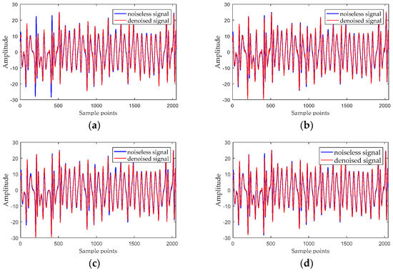 where x and are the noiseless signal and the denoised signal; N represents the length of the signal. The time-domain waveform before and after noise reduction for noisy Chen’s signal when SNR = 11 dB are shown in Figure 9.