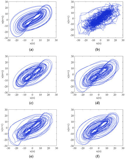 Phase diagrams for (a) the noiseless Chen’s signal; (b) the noisy Chen’s signal when SNR is 11 dB; (c) the EMD-DE-IT method; (d) the EEMD-DE-IT method; (e) the CEEMD-DE-IT method; and (f) the proposed method.