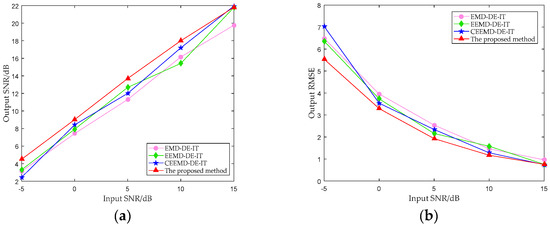 To further compare the noise reduction effect, we added −5 dB, 0 dB, 5 dB, 10 dB, and 15 dB white Gaussian noise in the Chen’s signal, respectively. Figure 11 presents the comparison of the SNR and the RMSE of the above four methods. The results are averaged from 10 random experiments. It can be seen that the performance of EEMD-DE-IT is similar to that of CEEMD-DE-IT, and the performance of EMD-IT method is poor at high SNR. Experiments show that the proposed method has better noise suppression ability for the Chen’s signal with low SNR. From the RMSE point of view, the reconstruction accuracy of this method is better than other methods at low SNR.