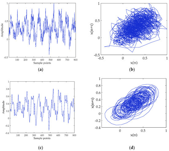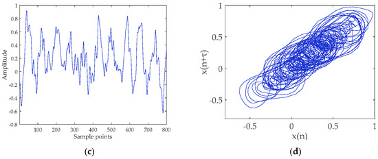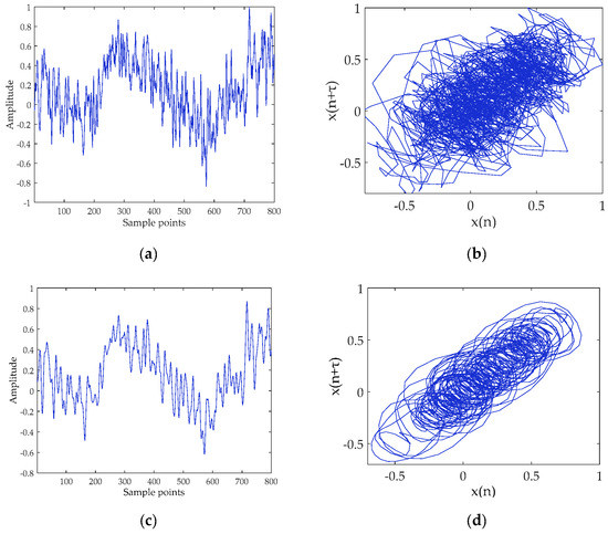 Ship-II and denoised Ship-II signals and their attractor trajectories. (a) Ship-II (select 800 points); (b) attractor trajectory for Ship-II; (c) denoised Ship-II (select 800 points); and (d) attractor trajectory for denoised Ship-II.
