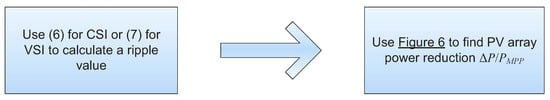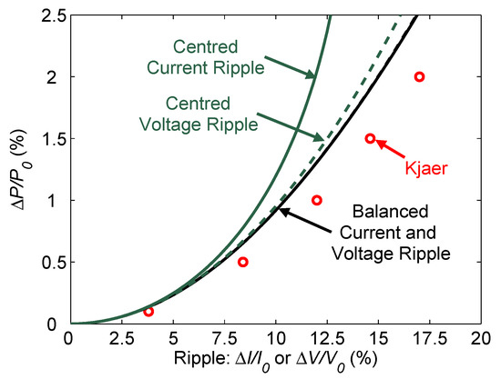 - a more accurate estimation of PV output power loss was achieved using the “balanced” definition of current (or voltage) ripple. This is related to the equal power decrease at the extreme points in comparison to the case that the ripple was centered on the optimum point;