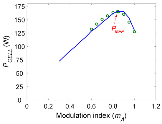 - the inverter efficiency increases with modulation index and, subsequently, a trade-off exists between the ability of the MPPT and the inverter efficiency, for cold conditions; and