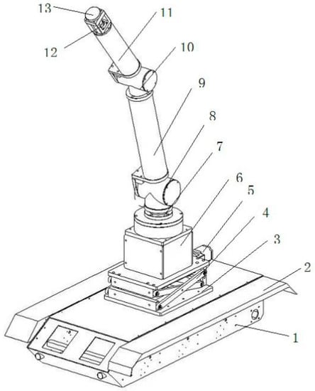 Manipulator structural drawing of picking robot (1: picking robot platform; 2: platform; 3: robot base; 4: lift platform; 5: servo motor; 6: robot lumbar; 7: lumbar rotating shaft; 8: main arm joint; 9: main arm; 10: small arm joint; 11: small arm; 12: rotating shaft; 13: grasp hand installation seat).