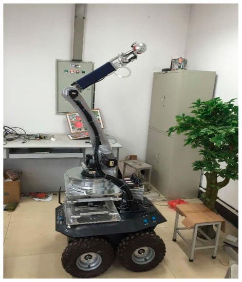 Since the apple trees are relatively high and the fruits are disperse, the higher degree of freedom of the picking robot manipulator brings not only the kinematics algorithm complexity, but also the waste of joint freedom degree, which is disadvantageous to the practicality of agriculture. This reduces the requirements of the manipulator and minimizes the usage of freedom degrees. So, this paper introduces the self-designed five degrees of freedom (DOF) manipulator, which is shown in Figure 1. Figure 2 is a schematic view of the picking robot manipulator. The manipulator gripping device adopts a curved design in order to reduce the damage of the apple during the process of picking up the apple. Figure 3 shows a wheeled picking robot.