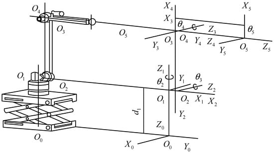 The manipulator is a complex system, since it includes various disciplines such as kinematics and dynamics. Kinematics analysis is used to model according to the relationship between the spatial posture and the angle of each joint of the manipulator. The designed structural kinematics parameters of the manipulator are shown in Table 1. In the table,  is the torsion angle,  is the length of the connecting rod,  is the joint angle,  is the offset of the connecting rod, σ = 0 is the rotating joint, σ = 1 is the direct acting joint, and  is the other constant. The use of the D–H rule to determine the coordinate position of the connecting rod is shown in Figure 4.