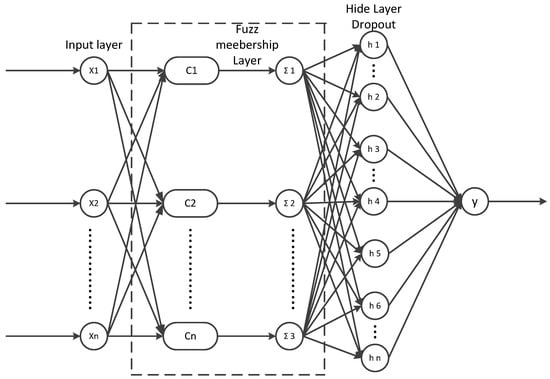 The fuzzy neural network is a kind of special neural network that is a hybrid intelligent system formed by the combination of neural network and fuzzy logic. It combines the two kinds of techniques by combining the human-like reasoning of fuzzy systems with the learning and connection structure of neural networks [,]. In a nutshell, the fuzzy neural network (FNN) assigns a conventional neural network to fuzzy input signals and fuzzy weights. Its function is to use the fuzzy neural network structure to implement fuzzy logic reasoning.