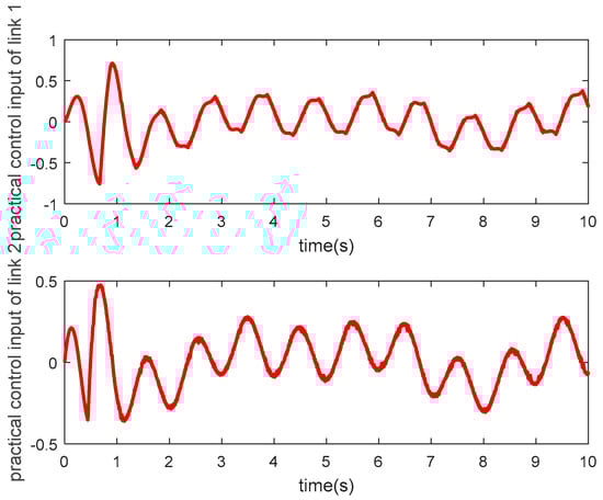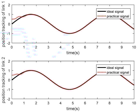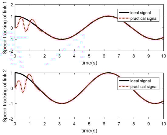 The simulation results of a manipulator system with an improved fuzzy neural network sliding-mode control algorithm are shown in Figure 13, Figure 14 and Figure 15. From Figure 15, it can be seen that compared with the traditional SMC scheme, the proposed fuzzy neural network sliding-mode control algorithm effectively eliminates the control chattering phenomenon. Meanwhile, the angular velocity tracking of joint 1 and joint 2 is more robust. It realizes high-precision control without detailed system information, and embodies the superiority of the improved fuzzy neural sliding-mode control algorithm.