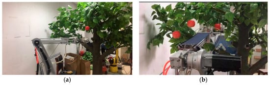(a) Representing the movement process of the robot arm of apple-picking robot; (b) Representing that the picking machine recognizes the target and controls the robot arm to grasp the target through the algorithm presented in this paper.