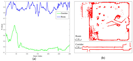 The comparative results of the k-value in different scenes. (a) The k-value in two typical scenes. (b) The corresponding lidar scan maps.