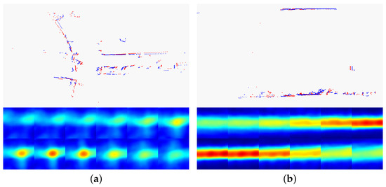 Comparative examples of different scenes. The cost function is visualized with each tile representing a slice of the cost volume for a fixed orientation. Red color represents high cost volume and blue color represents low cost volume. (a) An example with the value of k near . (b) An example with a small value of k.