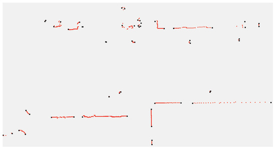 where is the distance from to the origin of the coordinate, corresponds to the angle interval of the range scan, is an empirical value determining the radius of the threshold circle and corresponds to the measurement accuracy of the laser scanner. A breakpoint is detected when the distance between consecutive points exceeds . An example is shown in Figure 5, where the black points represent breakpoints and the red point sets between two consecutive breakpoints belong to one cluster.