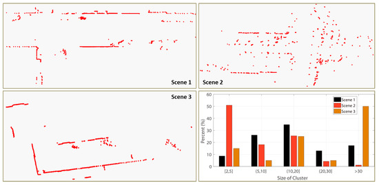 Besides the above two features, we introduce another five-dimensional feature based on the size of the cluster. We discretize the size of the cluster into 5 levels, and calculate the ratio of each level , where is normalized. We termed this feature as Cluster Distribution Histogram (CDH). The size of each level is set empirically. This five-dimensional feature together with the first two features constitutes the distribution of the point cloud clusters. Three examples of CDH from our real scan data is shown in Figure 6.