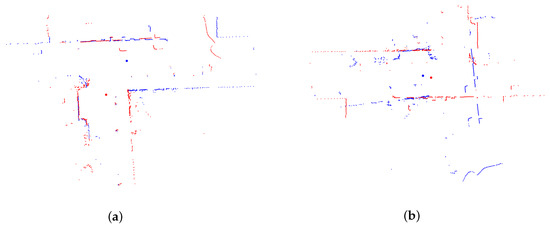 An example of false loop closure detected by DIMC. The blue points belong to the target scan and the red points belong to the source scan. The translation error between (a) and (b) is 2.624 meters. (a) Direct matching result. (b) Inverse matching result.