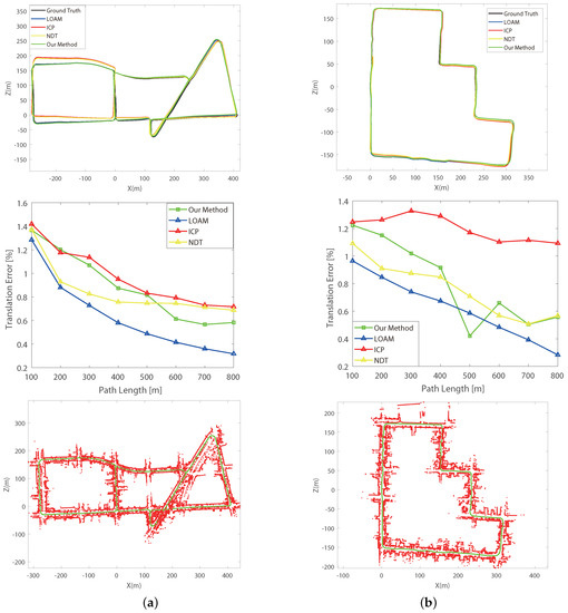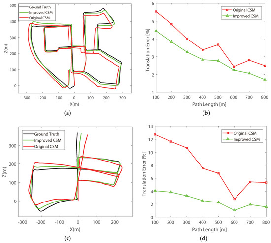 For the first experiment, we perform the simple laser scan alignment without loop closure detection or back-end optimization to validate the improvement of our front-end method. The comparative results of the original CSM and our improved CSM are shown in Figure 9. The translation errors are evaluated following the KITTI’s protocol with lengths (100 m, 200 m, ⋯, 800 m) in 2D coordinates [32].