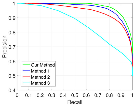 We choose three other approaches for comparison: Method 1 [11] is the most similar one to our method, and the main difference is that we utilize more features as described in Section 3.2; method 2 is based on Support Vector Machine (SVM) using the same features as our method; method 3 is based on deep learning algorithm similar to [13]. Figure 10 shows the precision-recall curves for all these three approaches together with our proposed approach.