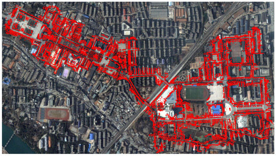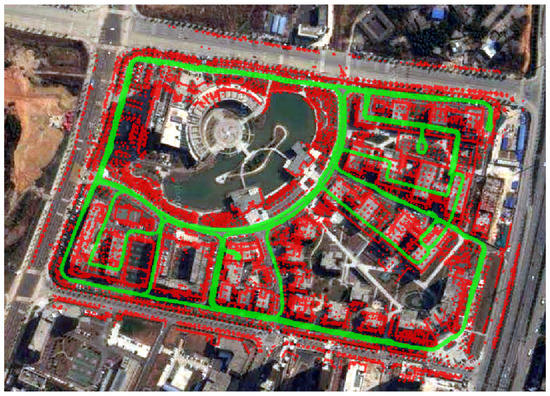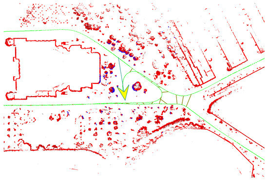 Figure 11 shows the mapping of campus area, where the map (shown in red dots) is projected onto a satellite image. The map shows a good consistency with the satellite image. Besides campus , we also test our 2D-SLAM system on several other datasets including a dataset from the Zhongdian Science and Technology Park as shown in Figure 12. Results indicate that our system works consistently well in large-scale outdoor environment. Figure 13 shows a snapshot of our mapping process. The red points are obstacles mapped online; the blue points represent the current laser scan; the green points represent the vehicle trajectory and the dark yellow lines are the loop closures. The current vehicle pose is shown as the yellow arrow.