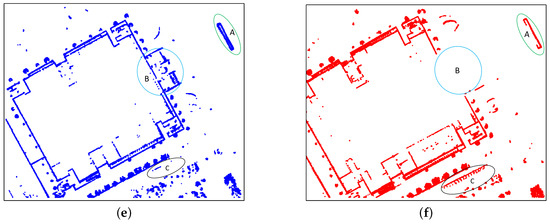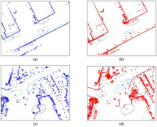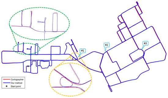 We qualitatively compare our method with a state-of-the-art 2D SLAM algorithm: Cartographer [12]. Figure 14 shows the trajectories generated by our method and cartographer. As can be seen from Figure 14, our method can compete with cartographer in terms of accuracy. For computational efficiency, our method built the whole map in 27.54 minutes compared with 31.09 min for cartographer. Detailed comparisons of these two approaches are shown in Figure 15, where scenes , and are labeled in Figure 14. For scene , cartographer generates a wrong loop closure which results in blurry lines at place A. As for our map rendering step applies dynamic objects filtering borrowed from Wang et al. [35], the unreliable points are filtered effectively. The different results can be seen from B and C in scene , A and B in scene as well as C in scene . Place C in scene along with A and B in scene indicate that our map contains richer details with less noise than cartographer.