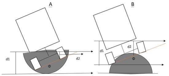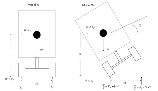 In this paper, we employ the simple rollover with the consideration of both stiffness and rigid suspension of the vehicle [23,24]. The input of the simple rollover model is the steering angle, while other inputs, such as the driver’s braking and road superelevation, are neglected. Two important rollover condition measurements, including the roll angle and roll rate of the vehicle, are output in this rollover model. Figure 1 shows the configuration of two rollover models, in which Model “A” (also known as zero degrees of freedom (DoF)) is a single-unit rigid vehicle without the consideration of tire compliance and Model “B” includes tire compliance producing a 1DOF model. In Model A, the autonomous vehicle’s tractor and trailer are lumped into one unit, which will lift-off at equal to zero when there is a vertical force. To predict the rollover of a vehicle that drives in an uneven off-road surface with obstacles and slopes in a more practical and significant way, Model “B” is used to measure the vehicle’s roll angle for the tire lift-of condition in this paper.