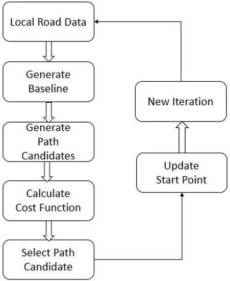 This section describes the proposed local path planning method with the incorporation of the vehicle rollover model, also called the rollover-free local path planning method, to build a safe and comfortable path under an appropriate speed and acceleration from an initial location to a destination. The algorithm method aimed to solve a 3D uneven local path planning problem based on a global route and map [29]. With the wide installation of LiDARs and cameras in most autonomous vehicles, we assumed that the 3D occupancy map was generated as the input to the local path planning method. The flowchart of the proposed rollover-free path planning method is given in Figure 3. For a given local road data, i.e., 3D occupancy map with open space and obstacles, we first generated the baseline that describes the curvature of the open space. Based on the current vehicle location and baseline, a group of path candidates were generated, and the optimal path that was collision- and rollover-free and most smooth was selected by evaluating the cost function of all path candidates.