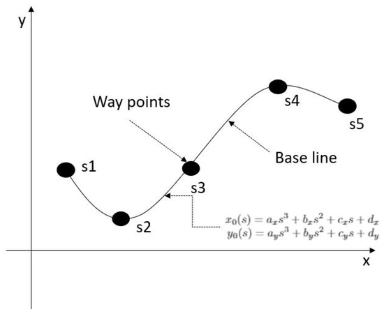 where (, ) is the Cartesian coordinates of the baseline and , , , , and , , , are the coefficients. As shown in Figure 4, the baseline of the bounded road can be divided into many segments by the center way-points. From Equation (4), each road segment can be described by a cubic spline.