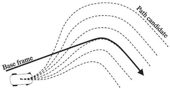 As shown in Figure 6, an example of generating the base frame and building path candidates from the center base frame is introduced. This generating process is based on Equations (4)–(8): Firstly, the input data from the autonomous vehicle’s sensors and LiDARs are the local off-road boundary; secondly, a coordinates system could be transferred from the Cartesian coordinates road base frame from Equation (4); thirdly, local path candidates in the coordinates system are generated by Equations (5)–(8). The generated path candidates’ ranges are related to the shape and range of the local map. Usually, it will be as close as possible to the local road boundary in order to cover a bigger planning space in the local map.