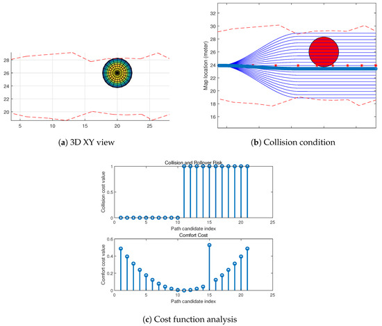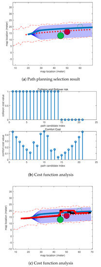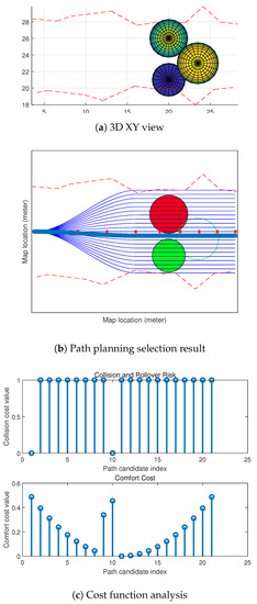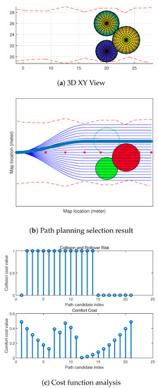 We first show two single static obstacle problems with our path planning algorithm in Figure 8. In Figure 8b, the obstacle filled with red indicates an obstacle that is over the road and causes a collision risk. A path candidate that avoids the risk obstacle is selected based on the minimal comfortable risk result, which is shown in Figure 8c, and the comfortability cost function Equation (16) is related to the candidate length s. In this experiment, the lowest comfortability cost index without collision risk was 10, so we chose the tenth path candidate for decision making. In Figure 9a, the rollover risk is taken into consideration as the autonomous vehicle passes over a hole that is too deep to avoid vehicle rollover risk. The single obstacle filled with green color indicates a static uneven pit on the road. The path selection strategy is similar to the previous collision risk model, and the result is shown in Figure 9b.