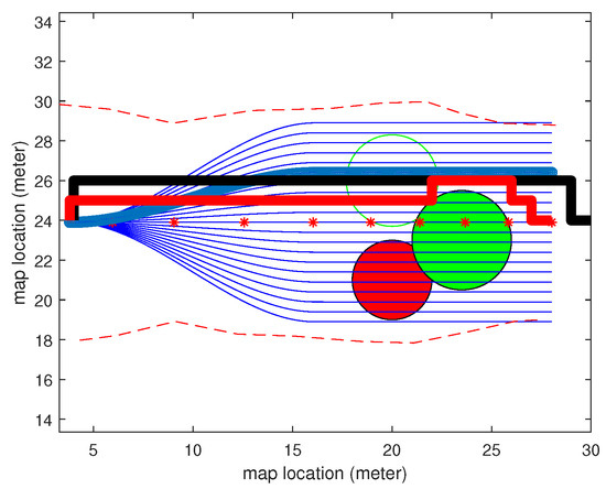 In Figure 10, simulations under two types of optimal path generation methods [36] are introduced and compared with our proposed method. The optimal path generated by the basic algorithm [37] is shown as the solid red line, and the one under the dynamic algorithm [38] is shown as the solid black line. The optimal path selected by our proposed method is shown as the bold blue line. We can tell from the simulation results that both basic and dynamic methods attempted to find a shortest path between the start point and target by avoiding obstacles. It can be demonstrated that our proposed path planning algorithm had the following advantages, compared to the method: