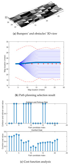 As shown in Figure 11a, we imported an view to introduce the multiple obstacle passing situation more clearly. The lighter color view indicates that there is an obstacle, i.e., higher than the road surface or , and the darker color indicates that there is a pit/hole, i.e., lower than the road surface or . In Figure 11b, the proposed path planning algorithm can be also applied to the road with multiple obstacles. There are three obstacles on the road: an obstacle that can cause collision risk colored in red, an obstacle that can cause rollover risk colored in green, and the third obstacle that is safe to pass. In the rollover and collision check part, we can tell by analysis of Figure 11c that only one obstacle is safe to pass, which is the same as the condition we described before. According to the comfortability cost analysis, the optimal path candidate with the minimum comfortability cost is finally selected.