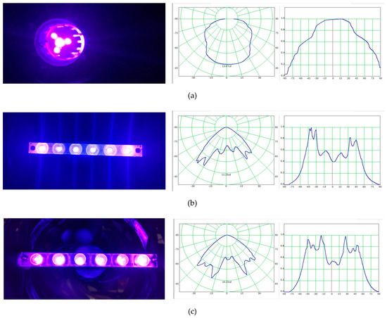 We simulated and analyzed the luminous intensity distribution curve (LIDC) in the space of the traditional LED mosquito lamp and the SFLD’s designed UV LED strip module using the TracePro optical software, as shown in Figure 4.