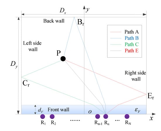 Assume that a single-channel radar is monitoring an enclosed room with four separate homogeneous walls and a synthesized array centered at the origin is placed against the wall surface at , , …, , as shown in Figure 1. The front-wall surface is located along the x-axis, and the back wall is parallel to the x-axis with a length . The left- and right-side walls are symmetric about the y-axis with a length . We consider the direct path from target P to antenna as path A and three first-order multipaths as paths B, C, and E. The refraction points of the first-order multipaths on the back wall and the left- and right-side walls are , , and , respectively.