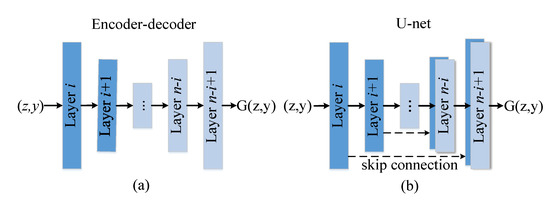 In the original GAN generator [13,18], they mainly adopt a decoder structure to map a vector to an image. Conditional GAN [19,20] almost continues this tradition by an encoder-decoder structure [21], as shown in Figure 3a, which has two drawbacks of information loss and a high training complexity because all information flows through the whole network. However, in the radar image, there is some shared information between the input and output, such as the edges and positions of target images. In order to solve information sharing, in this paper, a skip connection is adopted to enable some information to bypass the middle layer and its specific structure is U-net network. The specific method is to connect the i layer with the layer, as shown in Figure 3b.