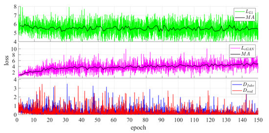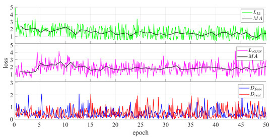 For the convenience of practical training, minimizing in objective function Equation (5) is replaced by maximizing . Minibatch SGD (stochastic gradient descent) and the Adam optimizer are adopted with momentum parameters and . The batch size is set to 1. Moreover, in Equation (5) is set to 100. All training is run on a single GeForce GTX1080Ti GPU (with 11 GB memory). The loading process of a G network requires 54.414 MB of memory, and the loading process of a D network requires 2.769 MB of memory. As a result, the training of GAN requires at least 57.183 MB of memory, and the testing of GAN requires at least 54.414 MB. The weights of all filters are initialized from a Gaussian distribution with a mean of 0 and a standard deviation of 0.02. In the training of Dataset 1, 50 epochs are trained and each epoch consumes an average of 144 s. In the training of Dataset 2, 150 epochs were trained and each epoch consumes an average of 298 s. The learning rate of the first 100 epochs is 0.0002, and the learning rate of the last 50 epochs is reduced by 0.000002 each time.