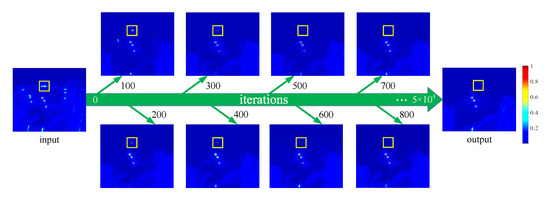 After 150 epochs of training of Dataset 2, the curve of loss is shown in Figure 8. Compared with Figure 5, the has a different (ascent) trend due to the mismatch of evolution speed between G and D in the early stages. In a complex situation with a large number of multipath ghosts, the reason for a mismatch could be summarized into two conflict points. On the one hand, complex multipath ghosts bring convenience to D to identify the radar image from G or ground truth. On the other hand, it makes it difficult for G to eliminate multipath ghosts. The mismatch increases the training time, appearing as the ascent trend of in Figure 8. The performance of GAN, varying from the iterations, is shown in Figure 9, which indicates that multipath ghosts are gradually suppressed but target images are gradually formed.