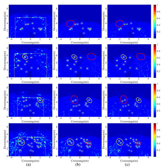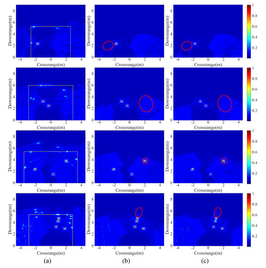 The results of Dataset 1. (a) Input images. (b) Ground-truth images. (c) Output images. The red ellipses mark the differences between the output images and the ground-truth images. The yellow lines mark the walls’ locations. The white rectangles mark the targets’ positions.