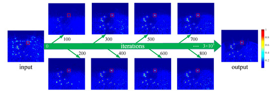 The result of the final training is shown in Figure 10. Although the situation is more complicated, multipath ghosts are still correctly eliminated. It is worth noting that true target images can be preserved even if targets are overlapped with multipath ghosts. For example, the overlapped target images marked with red rectangles in the input images are clearly preserved in the output image.