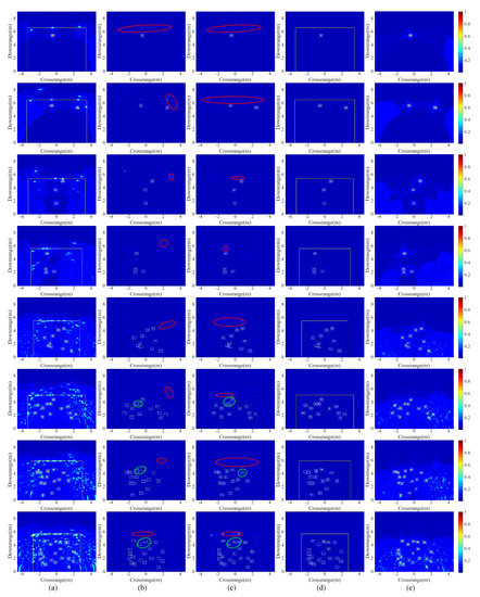As shown in Figure 11b, the PCF method is unable to eliminate well-focused multipath ghosts, marked by red ellipses in the case of synthetic aperture imaging (SAI). In Figure 11c, a part of the multipath ghosts, marked by the red ellipses especially about the back wall, still exist with the subaperture-fusion method, as they appear at the close positions in both subaperture images. Figure 11d demonstrates that the imaging-dictionary-based method has an excellent performance in suppressing multipath ghosts while it needs the prior walls’ locations. In Figure 11b,c, the PCF method and the subaperture-fusion method enlarge the energy differences between the target images, which makes it difficult to identify degraded targets such as target images marked by green ellipses with a low SMCR that is a ratio between the peak of the target image and its multipath ghost [10]. As a comparison, as shown in Figure 11e, the proposed method achieves an excellent multipath suppression without walls’ locations. Moreover, the proposed method prevents the difference of target images from enlarging, which is beneficial to identifying all targets.