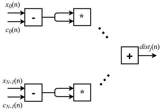 The j-th distance shown in Equation (2), is computed in parallel as in Figure 2. It is important to note that all arithmetic operations are performed in parallel which increases performance regarding throughput.