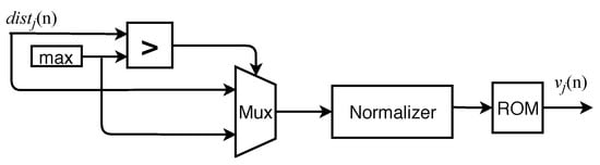 Having the value of , the calculation of the Equation (2) is done using Read-Only Memory (ROM), composed of LUTs of depth 9. The circuit to convert the distance to memory addresses is illustrated in Figure 3. Being , the upper edge of the function domain and normalizer the circuit responsible for converting from distance metric to memory address. To discretize the gaussian a maximum value for the distance of 4 and a minimum of 0 was considered. Within that range the gaussian was evaluated at steps of and the values were stored on the ROM memory, which resulted in 401 values being stored. The normalizer then divides the output of the mux with the discretization step.